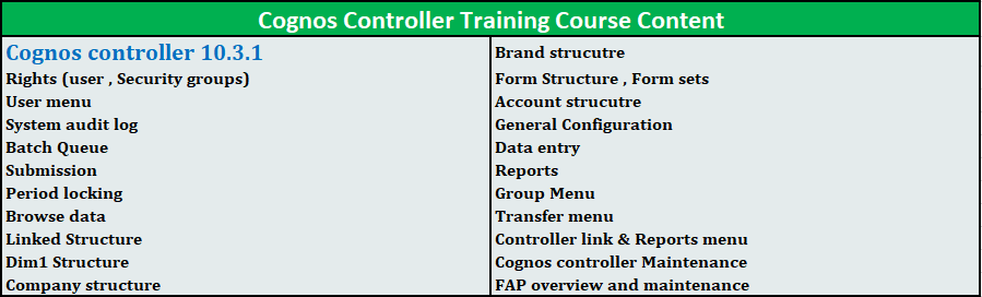 COGNOS CONTROLLER ONLINE TRAINING COURSE CONTENT: